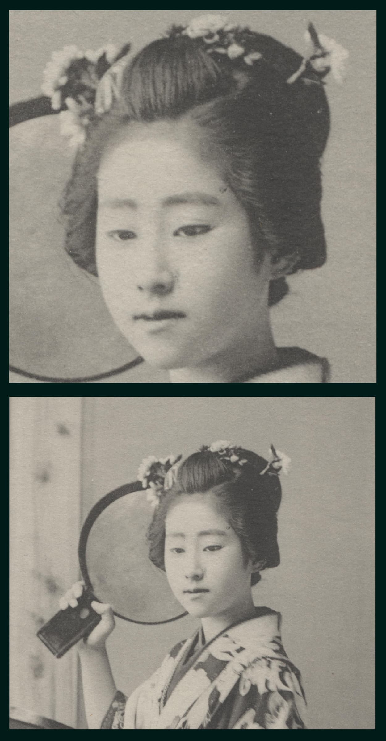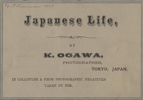 Ogawa, K. (Kazumasa) Japanese Life, Yokohama, Kelly & Walsh, Folio (11 3/4 x 16 in - 30 x 40.5 cm), 1895, decorated card covers, string ties, spine not covered, 12 black and white collotype plates with a total of 27 different images. There are 7 plates with one image each and 5 plates with 4 images each. Each plate is protected by tissue guard and has a descriptive title below the image on the plate. Many seldom seen images to include "Darby and Joan (an elderly couple tending to chores) and an "old-time policeman and his catch." This books should not be confused with the K. Ogawa books (8vo) under a similar title, Illustrations of Japanese Life. The images in that series are not found in this book. The book is accompanied by a Kelly & Walsh "Sole Agents" color woodblock insert page. For information on Kazumasa Ogawa, click here.