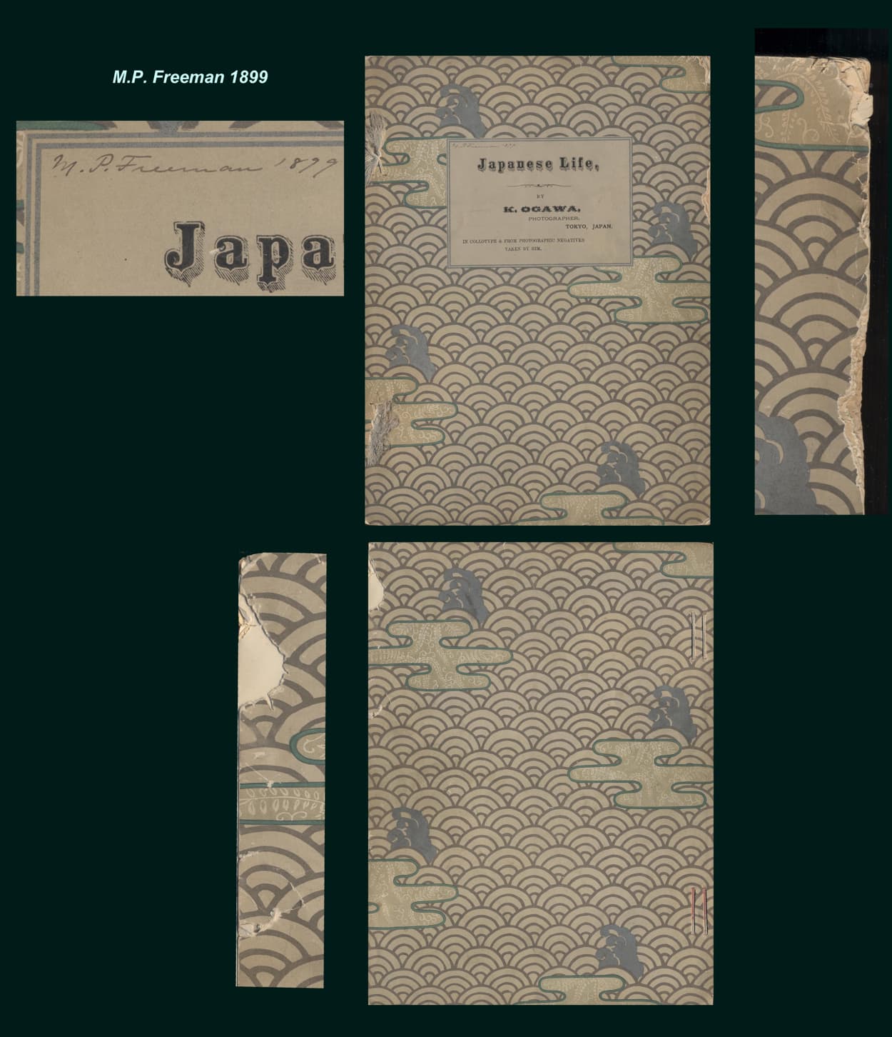 Art and Artifice, Japanese Photographs of the Meiji Era, Boston, Museum of Fine Art, 2004, horizontal 8vo (8 1/4 x 10 1/4 in), blue cloth with paste on title and accompanying decorated slipcase with paste on title (hardback version), blue string page marker, numerous plates and text illustrations - most in color, 95 pp. The book is constructed to resemble a 19th century Japan tourist photograph/collotype album. Starts with a discussion by Sharf on tourist travel to Japan which began flourishing in the 1870s and 1880s. His focus is on Yokohama which was the traveler's point of arrival. Next Sebastian Dobson discusses the "Yokohama Shashin" (Yokohama photographs) trade. Discussed in this section are noted photographers such as Felice Beato, Baron Raimund von Stillfried-Ratenicz, Uchida Kuichi, Kusakabe Kimbei, Adolfo Farsari (Sargent, Farsari and Company), Tong Cheong, the Japan Photographic Association (Farsari & Kozaburo Tamamura partnership), David Welsh (Yokohama Photographic Company) and Kozaburo Tamamura. A discussion by Anne N. Morse considers the ("meisho-e" - famous scenic places) genre of images captured in Meiji era photographs and art. These sections are followed by an exceptional section with reproductions of 39 color plates. In a list that follows technical information (where know) for each plate is provided (photographer, subject of image, date, type of print and size in cm). Issued in softcover also. ISBN: 0-87846-683-5 (slipcased hardcover) and 0-87846-682-7 (softcover - published 2003). The softcover version has two Japanese style ornamental string ties but no ribbon page marker. The string ties are not found on the hardcover version.