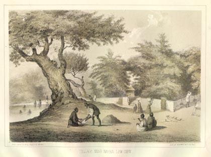 This lithograph depicts everyday life in a village near Naha. Dress of the young and old is depicted.