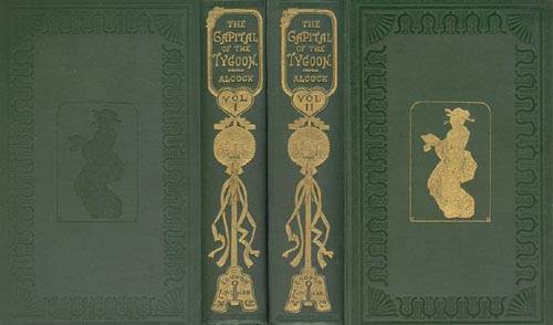The Capital of the Tycoon: A Narrative of a Three Years' Residence in Japan, London, Longman, Green, Longman, Roberts & Green, 1863 (1st ed), 2 volumes, 8vo, green blindstamped cloth with gilt illustrations and lettering on front covers and spine, 16 tissue guard protected chromo-lithographs (2 frontispieces and 14 in the text), 128 black and white woodcut engravings, 2 folding colored maps, 469 pp / 539 pp. At the back of volume 2 is a 39 page index (pages 501-539) covering both volumes. This is followed by 24 pages of publisher's advertisements. The front cover of volume 1 has a vignette of a samurai embossed in gold and an unembossed vignette of a lady on the back cover. This is reversed in volume 2 with the lady on the front cover embossed in gold and the samurai on the back cover unembossed. The top edge is untrimmed and the bottom and side edges are trimmed. Printed by Spottiswood & Co. Printers, New-street, London.