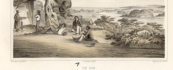 Similar to Type II but titles/lettering at bottom are entirely different from those on Type I through III. This is the only version of this lithograph I have seen where the Okinawan (figure to the far left) is holding the parasol with the top pointed down.