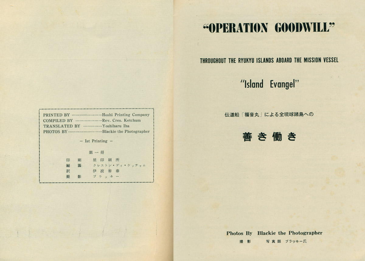 'Operation Goodwill' - Throughout the Ryukyu Islands Aboard the Mission Vessel 'Island Evangel', Okinawa?, Hoshi Printing Company, ca 1957, stiff wraps, front cover illustrated, 8vo (8 x 10 in) text in English and Japanese, 58 numbered black and white halftone photographs (2 or more per page), 8vo (8 x 10 in), 36 pp. The book documents an evangelistic visit to Zamami Island (in the Kerama Islands) of the Ryukyu Islands by Reverend Ketchum. Many of the photographs include Reverend Ketchum. Each photograph is numbered and notes provided regarding each photograph. There are no year dates provided in the book. The population of Zamami Village is stated to be 600. The photograph numbered 56 is of the boat "Island Evangel." The text notes that "Last March the people of Zamami finished a beautiful Peace Monument" (page 34). Photograph number 10 is of the members of the Okinawa Shrine Club with a crippled boy the Club was sending to the Shriner's Crippled Children's Hospital in Hawaii.