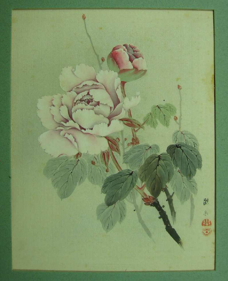 There are 15 collotypes [A collotype is a a kind of photo-lithograph in which glass replaces stone as the printing surface] of Japanese flowers produced by a process that could not be duplicated outside Japan. The colors used and mounting methods are most impressive. 15 to 25 colors were used in a single picture and each print passed through a press for each shade.