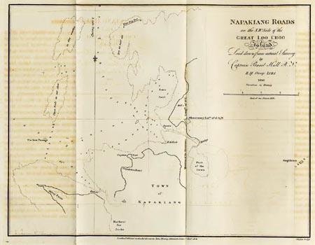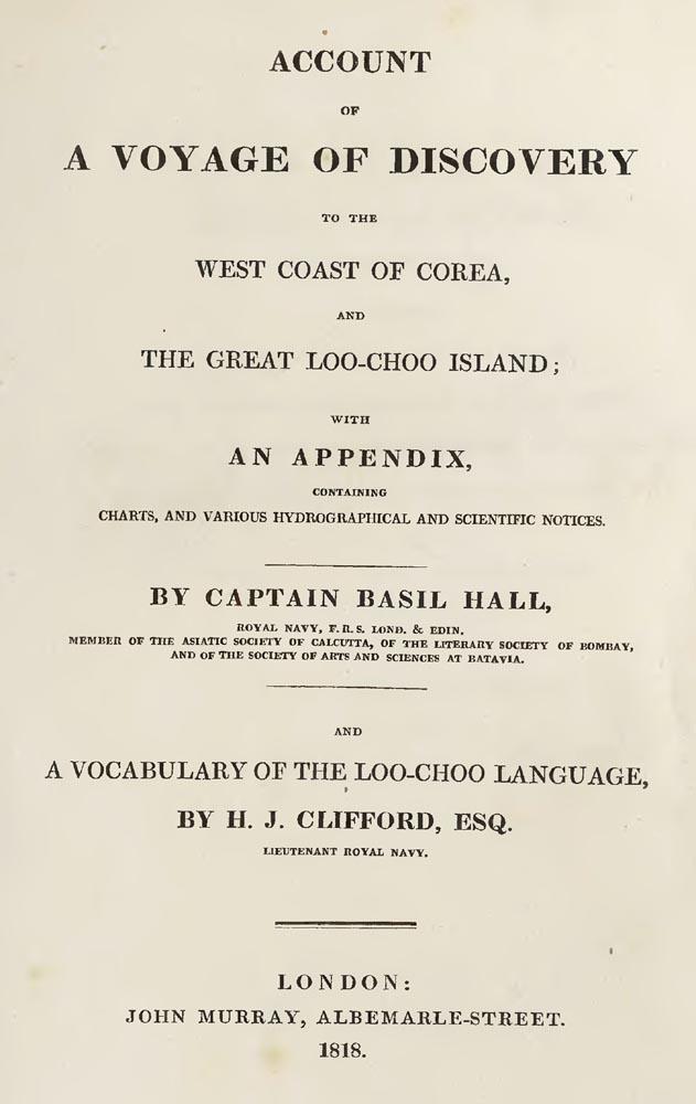 Account of a Voyage of Discovery to the West Coast of Corea, and the Great Loo-Choo Island, London 1818, Murray, 222 pp + 72 pp of vocabulary, squarish 4to (27 x 22 cm), appendix, glossary, 8 hand colored engraved plates, 1 black and white engraved plate, 5 engraved charts/maps (including 2 folding maps) and a further plate of scientific instruments. An appendix contains charts, and geological/ hydrographical/ scientific data, an abstract of the Lyra's voyage and a vocabulary of the Loo-Choo language by H.J. Clifford. The tissue guarded plates were drawn by William Havell, one of the best early painters in water-color, and engraved by Robert Havell based on sketches by the author and C. W. Browne. The plates include views of Sulphur Island, Napakiang, various officials, gentleman of Loo-Choo in his cloak, one of artifacts, etc. This expedition formed part of Lord Amherst's embassy and explored the relatively little known East China Sea and the Yellow Sea. Visits were made to Korea and the Ryukyu Archipelago. Korea had been sketchily explored by Europeans, but it was not until the frigates Alceste and Lyra expeditions that detailed information was obtained about the Ryukyus.