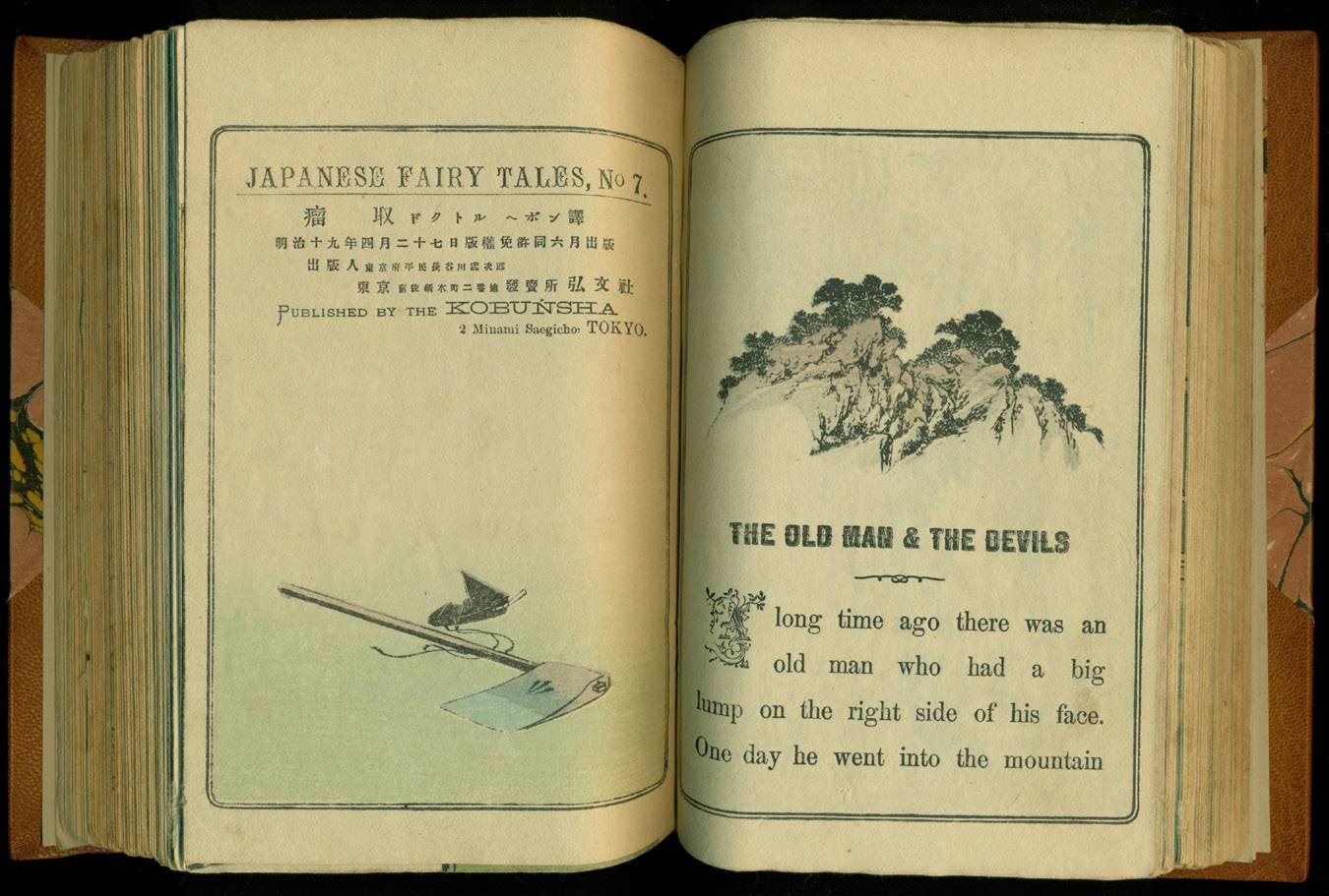 Kobutori, [Japanese Fairy Tales, No. 7], Meiji 19 (1886), Tokyo (2 Minami Saegicho), Kobunsha imprint, title on cover is transliterated into English medium size for a Hasegawa/Kobunsha book, 12mo (5 x 7 1/4 in - 12.6 x 18.3 cm), plain paper (not crepe) in folded sheets, 22 pp - 11 folded pages (including covers). The colophon indicates a printing date of April 4, 1886 and a publication date in June.
