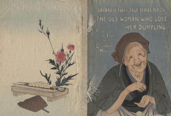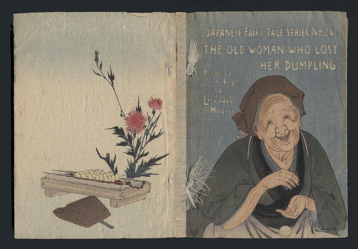 The Old Woman Who Lost Her Dumpling, Rendered into English by Lafcadio Hearn, No 24, Japanese Fairy Tale Series (English), ca 1902, 38 Honmura-cho, Yotsuya-ku, Tokyo, T. Hasegawa - Publisher and Art Printer, medium size for a Hasegawa/Kobunsha book, 12mo (5 1/4 x 7 1/2 in - 13.5 x 19.2 cm), crepe paper in folded sheets, spine covered, silk tied, 2 pages of publisher's books at the rear, 24 pp - 12 folded (including covers). The title on the first page of text reads Dumplings whereas the title on the cover is Dumpling. One book listed (Chin-Chin Kobakama) was published the year after this book was first published. The front cover and back covers are nicely illustrated in color.