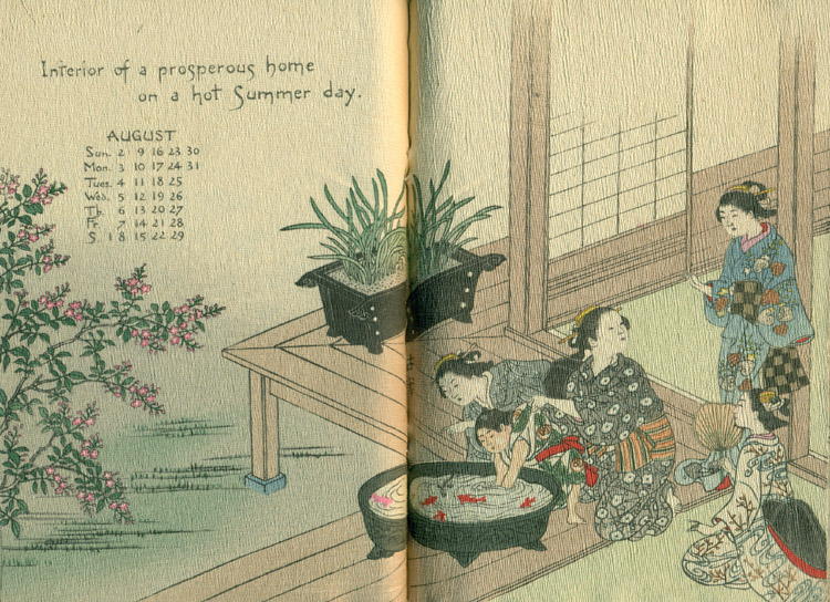 The Months of Japanese Ladies, Calendar for 1903, Tokyo (38 Yotsuya Hommura), "Printed and Published by T. Hasegawa, Tokyo, Japan," calendar published in a book form, small 12mo (5 x 7 in - 12.8 x 17.8 cm), spine covered, medium size for a Hasegawa book, silk stab ties, 13 folded crepe paper pages, 26 pages total including covers. Each month is represented by a color woodblock print that spans the page on the left and across the facing page (page on right).