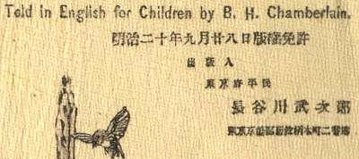 This work was prepared at the same time that Chamberlain's Aino Fairy Tales No. 1 and No. 2 were being prepared for publication by The Kobunsha/T. Hasegawa. Variants of the three of the folk tales in Chamberlain's 1888 book are found in the T. Hasegawa color woodblock illustrated books. Information on Basil Hall Chamberlain's Aino-Fairy Tales published by Takejiro Hasegawa is here.