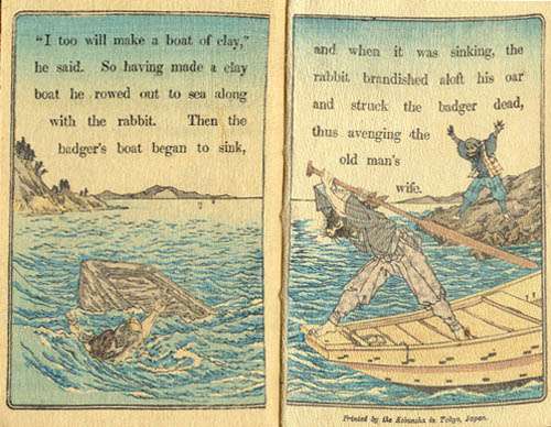 Kachi-Kachi Mountain, No. 5, Japanese Fairy Tale Series (English), Tokyo, Meiji 21 (1888), printed by the Kobunsha (T. Hasegawa) for Griffith, Farran & Company, London, small size for a Hasegawa/Kobunsha book, small 18mo (3 3/4 x 6 in - 9.7 x 15.1 cm), crepe paper folded sheets, spine covered with silk type fabric, bound Western style with no stab or external string ties, 22 pages total including covers (11 folded pages). The front and back covers are nicely illustrated in color. Sensei Eitaku was the artist who created the illustrations.