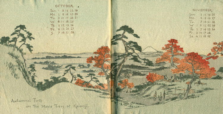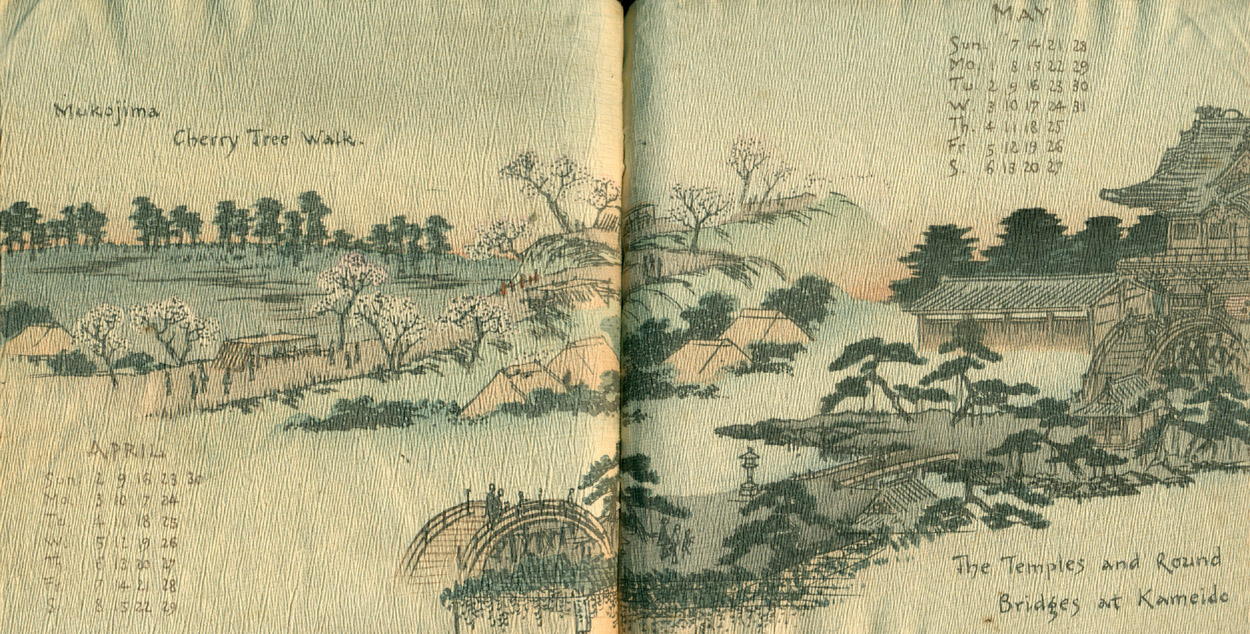 Landscapes of Tokyo, Calendar 1905, Tokyo (Honmura, Yotsuya), 1903 (Meiji 37), square/large 16mo (5 1/2 x 5 1/2 in - 14 x 14 cm), medium size for a Hasegawa publication, calendar published in a book form, 8 folded crepe paper pages, 16 pages total including covers. Each calendar woodblock print is viewed as a continuous scene from the left hand side of page across to the adjoining right hand side page. Except for January and December, each scene contains two monthly calendars within the image.