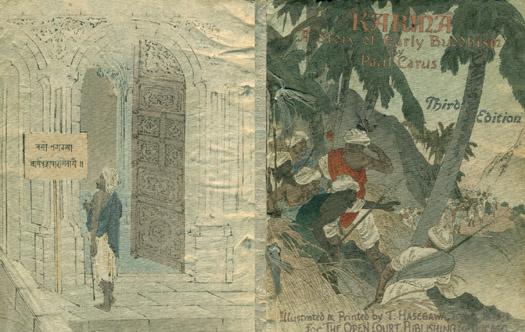 Karma, A Story of Early Buddhism, illustrated and printed by T. Hasagawa, Tokyo (10 Hiyoshi-cho) for The Open Court Publishing Co, Chicago, ©1894, stated Third Edition, Meiji 30 (1897), 12mo (6 x 7 3/4 in - 15.2 x 19.8 cm), crepe paper, silk stab ties, spine covered, 12 folded pages - 24 pages total (including the covers). Illustrated with color woodblock prints. The illustrations for this book were produced by Komiya Yasu. Illustrated front cover and illustrated colophon inside the back cover. The inside back cover continues the story and contains the colophon but is not numbered.