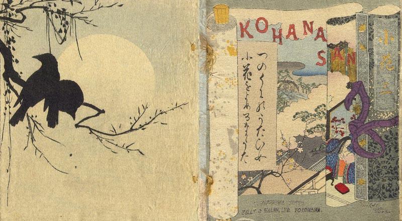 Kohana San, Hasegawa, 10 Hiyoshicho, Tokyo, Japan, Meiji 25 (1892).5.20, 12 mo (6 1/4 x 7 1/4 in - 16 x 18.4 cm), pages numbered, string tied. An illustrated story of Kohana San (Little Flower), a Geisha of Kobe, presented in song and woodblock illustrations. Music and verse, written by F. M. Bostwick, US Navy (actually Mae St. John), and sung to the air of "Bally Holly." Front cover reads, "T. Hasegawa, Kelly & Walsh, Ltd, Yokohama, Tokyo, 1892." Eleven pages of double folded creped paper (chirimen) for a total of 22 pages (front and back cover included in the count). Of the 22 pages, there are 20 pages with color wood block illustrations on them. The first part of the book is a musical score (sung to the tune of "Ballyholly"). The score is followed by additional sets of lyrics. No advertisement at the back.