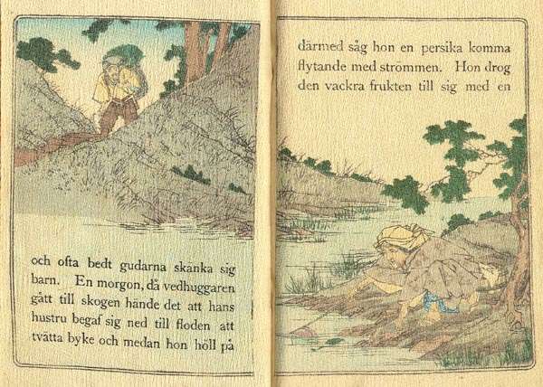 Momotaro Pa Svenska af Konni Zilliacus, Japanesika Sagor, Tokyo (10 Hiyoshicho), T. Hasegawa & Helsinki (Helsingfores), Wentzel Hagelstams Forlag, not dated but ca 1896, text in Swedish, small size for a T. Hasegawa book, large 18mo (4 1/4 x 6 in - 10.5 x 15.1 cm), text in Swedish language, crepe paper in folded sheets, spine covered, silk ties, 10 folded pages including the covers, 20 pages.