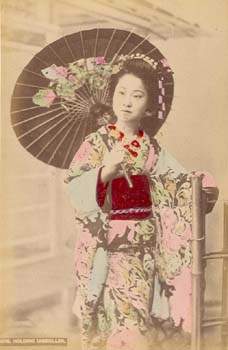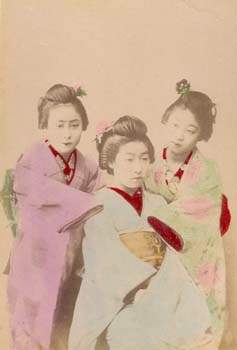 ![]() A Yokohama tourist trade photograph album which probably dates to the late 1890s. Lacquer over wood boards on the front and back containing 50 hand-colored albumen photographs. The covers measure 5 3/4 x 7 3/4 in (15 x 19.7 cm) while the individual photographs measure approximately 3 1/2 x 5 1/2 (9 x 13.6 cm). The front cover has a hand painted scene of a man and a woman with a lake and Mt Fuji in the background. The faces and hats of both the man and the woman are a white ivory (or ivory appearing) inlay. The back cover has a very subdued flower with and leaves pattern. The albumen photographs are tipped to thick card stock. Many have captions in the negative. The album is configured in accordion style. The first set of photographs open out in a continuous series from front to back. The second set of 25 photographs opens out from back to front (on the obverse of the mat with the first set. The first set of photographs is focused on scenes but not temples or shrines. There are many views of Yokohama, Nagasaki, Kyoto and the Inland Sea. The second set of photographs focuses on women. There is a "home bathing" scene in this set. The album carries no information as to the source/photographer or studio. Condition. The boards have light scratching, rubs, nicks and damage along the edge. They remain solid and have a satisfactory overall appearance. The accordion folds has been repaired in two spots with modern archival linen tape. The photographs are in Very Good condition with some fading and minor blemishes or faults. The first photograph in the second series has several surface abrasions. |