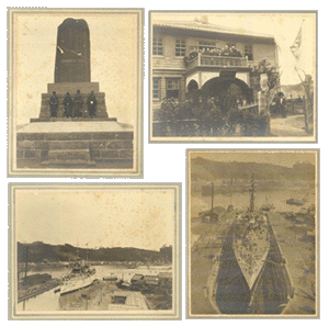 - Inscriptions/Notations on Back. Each photograph has a handwritten presentation inscription by "Captain S. Sakurai" who probably was a member of the official Japanese reception party at the monument dedication ceremony. The photographs were presented to "Warrant Machinist H.E. Kershaw, U.S. Navy." One photograph has a date of May 29, 1902 on the back. None of the others are dated. The photograph of the Perry monument has a typed note affixed identifying the four men in the photograph.