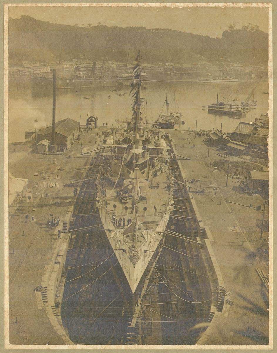 General Comment. I believe this is the USS New York under repair in a dry dock in Yokohama after the Perry Monument dedication. However, I can not find any notice that she did go in for repairs in Yokohama. This images was probably take between July 6, 1901, when she arrived at Yokohama, and October, 1901, when she departed Japan.