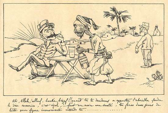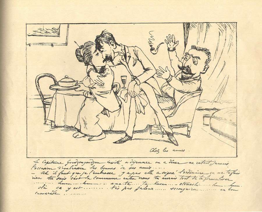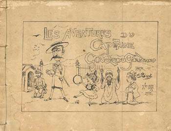 Les Adventures du Capitaine Goudzou Goudzou, Tokyo, Xbre 1897, large 8vo (8 3/4 x 11 3/4 in - 22.6 x 29.2 cm), paper wraps, string tied, 20 leaves/plates of black and white lithographs. All leaves are printed on one side only. The front cover is illustrated with a black and white lithograph. There is no title page. The plates are lithograph renderings of Bigot's "Toba-e" style sketch art. The book is a satirical account of "Capataine Goudzou Goudzou" who leaves his French military assignment in Africa and journeys to Japan where he cavorts about the country. The first six plates relate to Africa although one shows a Japanese soldier. The other fourteen relate to Japan. The cover is a mixture of African and Japanese images. One illustration (19th plate) shows a caricature of Captaine Goudzou in a room at No. 9, Yokohama, an apparent reference to the infamous brothel at No. 9, Nectarine, Yokohama. The final illustration shows Captaine Goudzou sailing away from Japan, as Bigot himself would do after a 20 year residence in a couple of years after the publication of this book.