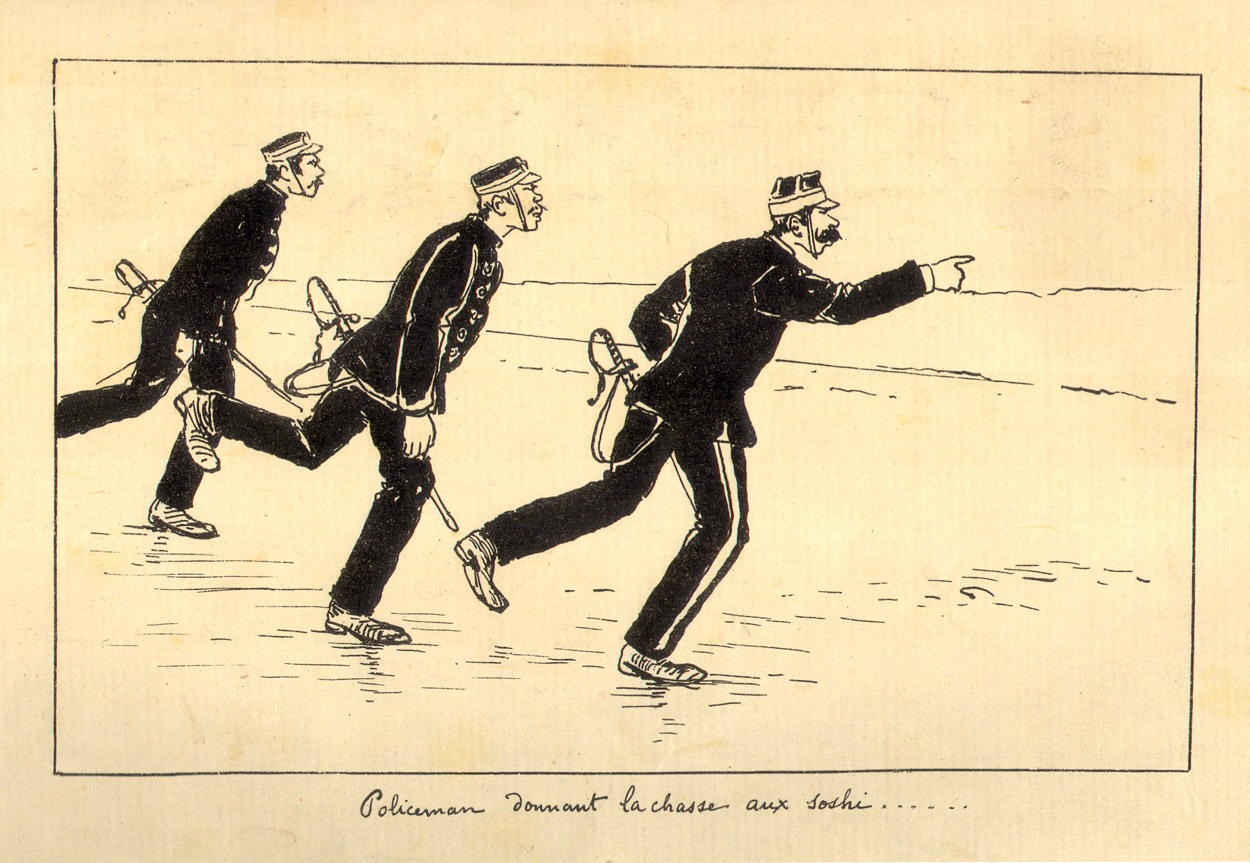 Georges Bigot, a French painter and sketch artist, resided in Japan from 1882-1899. Initially he taught drawing at the National Military Academy. He married in Japan and had a son, Maurice. Georges Bigot and Charles Wirgman (See The Japan Punch) are both noted for their satirical sketch art in Japan. In Japan, Bigot's art appeared in a number of works. It is said that he published over 30 books/albums with his sketch art. Additionally, it is believed that he published or contributed to over 100 different periodicals (most in Japan and a few in Europe). It has been reported that Bigot was engaged in amateur photography in Japan but I have found no photographic images attributed to him recorded in publications or offered on the market. In 1899 he divorced his wife, Masu, and departed Japan with his son. He returned to France where he remarried and began a career producing satirical drawings (Epinal prints), sketches for magazines and later landscape paintings. Many of the landscapes were of Japanese scenes. For a listing of books and periodicals associated with Georges Bigot, click here. Two recent articles regarding Georges Bigot are outlined below.