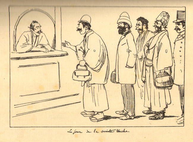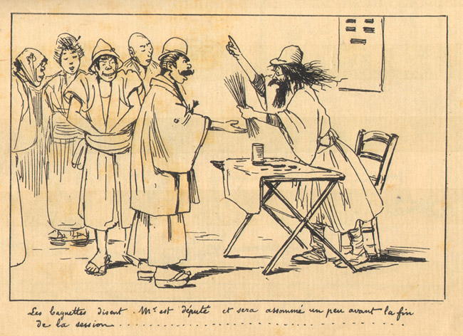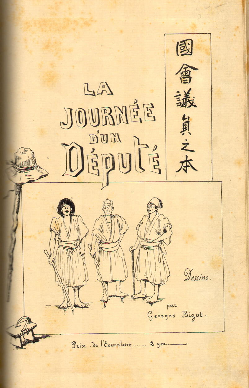 La Journee d'un Depute, Dessins par Georges Bigot, no date or location (probably Yokohama) of publication stated, ca 1890, 8vo (7 1/2 x 10 3/4 in - 19 x 27.1 cm), illustrated stiff wraps, string tied, front & back covers illustrated, title page which mimics the front cover, 15 folded pages with 30 black and white illustrations most with captions (in French), bound Japanese style with string ties.