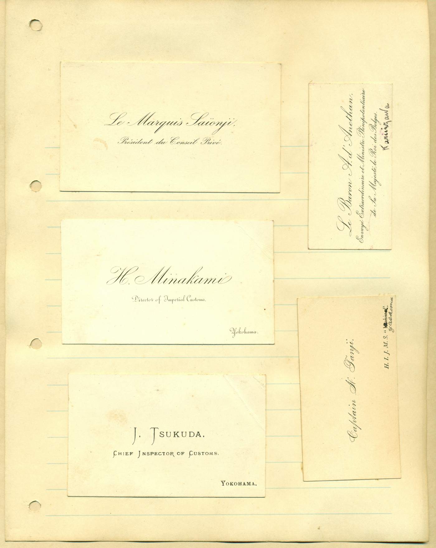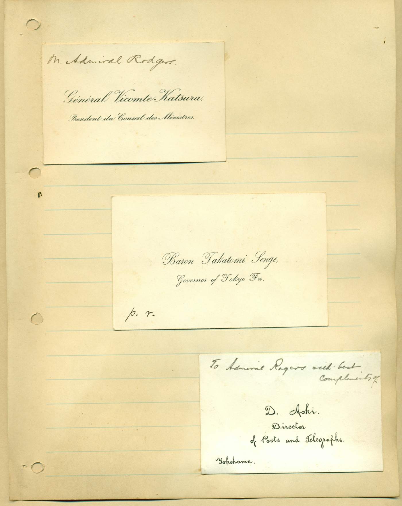 Admiral Rodgers would keep calling cards (meishi) he received at the various ports the U.S.S. New York called in. He maintained these cards by gluing them to standard letter size (8 x 10 inch) ruled writing paper. These pages were kept in a four post "Sissons Magic Standard" binder. They were maintained in chronological order with the first page of cards from that call generally dated and identified by location.