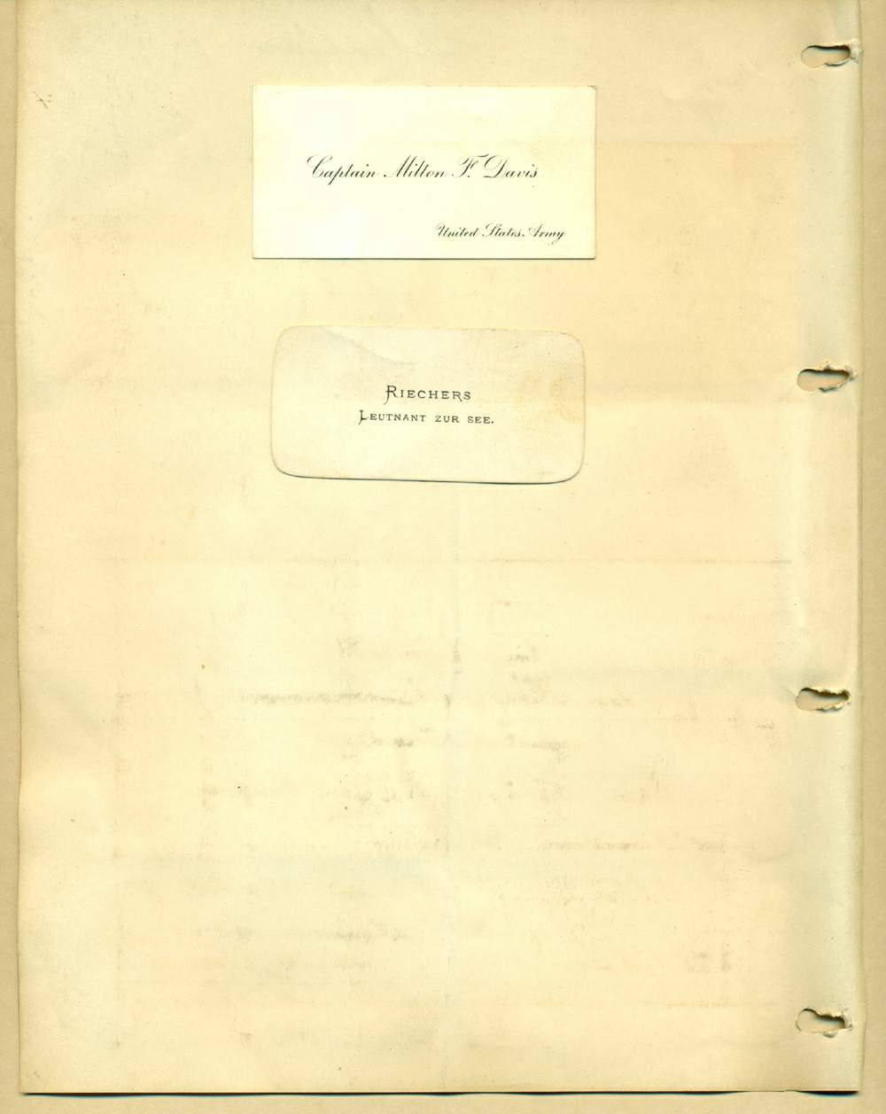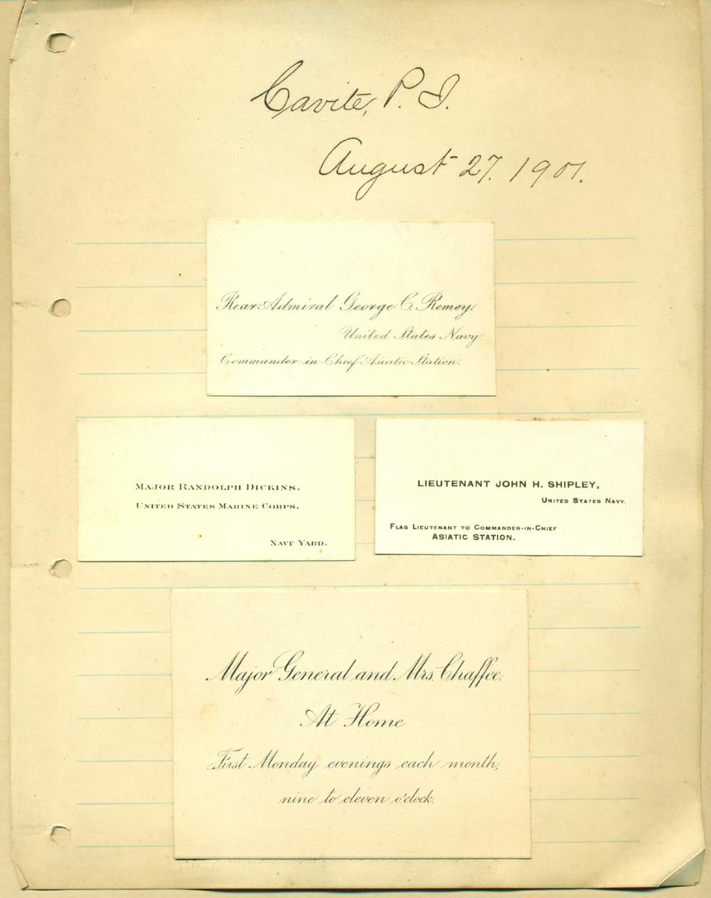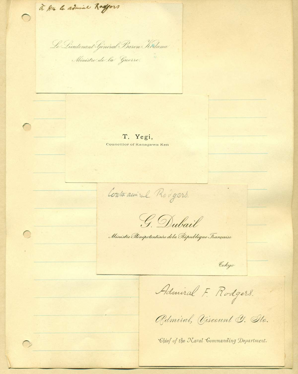 General Comment. This is a binder and the contents which contains calling cards from Rear Admiral Frederick Rodgers (Commander-in-Chief, U.S. Naval Force on Asiatic Station) visit to the Far East aboard his Flagship, the U.S.S. New York, during the period from ca March 1901 through July of 1902. During this time Admiral Rodgers participated in the dedication of the Monument to his grandfather, Commodore Matthew C. Perry at Kurihama, Japan on July 14, 1901. He also participated in Naval support activities of American military actions in the Philippines during the Spanish-American War.