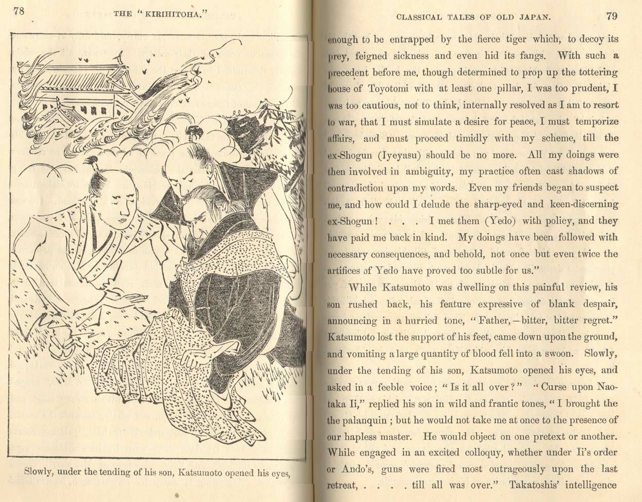 Classical Tales of Old Japan, Tokyo, published at the 'Japan Times' Office, 12mo (5 x 7 1/4 in - 13 x 18.5 cm), preface and colophon dated 1898 (Meiji 31), paper wraps, bound Western style but with two silk stab ties also, front cover illustrated with color woodblock, folding color woodblock print protected by tissue guard following the title page, 12 black and white full page woodcut illustrations, 80 pp. The book presents twelve "classical" Japanese tales translated into English. Each tale is accompanied by a black and white full page illustration a one or two sentence description relating the image to the tale. The frontispiece is a fold-out (1 fold-out) color woodblock print with artist's seals. It measures 8 3/4 x 7 1/4 in - 22.5 x 18.5 cm. The 12 tales are: 1) The Painter Matahei and His Zeal, 2) The Gate of Ataka, 3) Ordeal by 'Koto', 4) The Japanese 'Romeo and Juliet', 5) The 'Pot-trees' (Hachinoki), 6) A Private School; Loyalty in Olden Days, 7) Hikohichi Omori, 8) The White Banner of Genji; The 'Arm-bearing' Village, 9) The Novice's Trial, 10) How the Brothers Soga Avenged the Death of their Father, 11) The Sprite of the Willow-Tree, 12) The 'Kirihitoha,' or Death of Katagiri. According to the preface, many of these tales were originally published in The Japan Times.