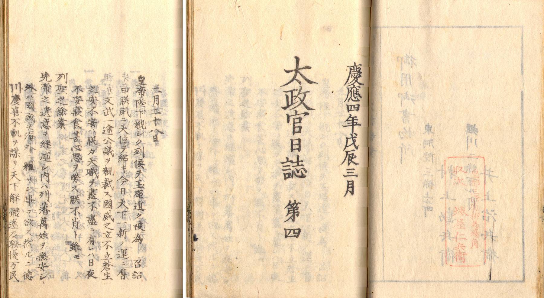 Dajokan Nisshi (Gazette/Journal of the Great Council/Council of State), Kyoto (1868) and Tokyo (late 1868 forward), Murakami Kanbee - printer in Kyoto and Suwaraya Mohee - printer in Edo (Tokyo), Keio 4 (1868) through Meiji 10 (1877), 8vo (6 1/8 x 8 7/8 in - 15.5 x 22.5 cm), paper wraps, text entirely in Japanese, string tied, folded pages, high quality laid paper, woodblock printed, issued periodically, generally several issues per month. The first issue was published February 23, 1868 (Keio 4) and the last issue January 23, 1877 (Meiji 10). The front cover of each issue states the issue number and the year and month of issuance.