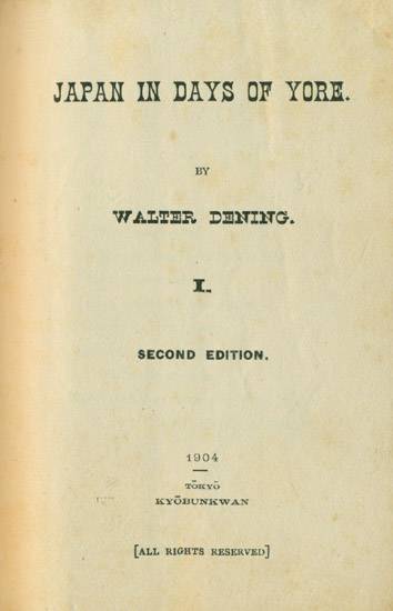 Dening, W. Japan in days of yore, historical tales of Old Japan. Second revised edition printed and bound in Japanese fashion with old style coloured prints, small 8vo, Tokyo, 1904-5 (each volume, 60 sen). Only four volumes were issued in this edition.