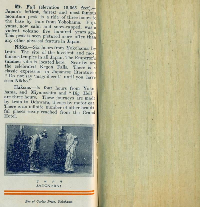 - ca 1920, The Grand Hotel, Yokohama , Yokohama, Box of Curios Press, not dated but ca 1920, card wraps, silk stab ties, pamphlet size (3 1/2 x 6 1/2 in - 8.5 x 16.3 cm), orange vignette on title page which shows through a cut-out on the front cover, 5 black and white full page halftone illustrations and 8 small halftone illustrations in the text, unpaginated but 12 pages total including the title page and full page illustrations. More information here.