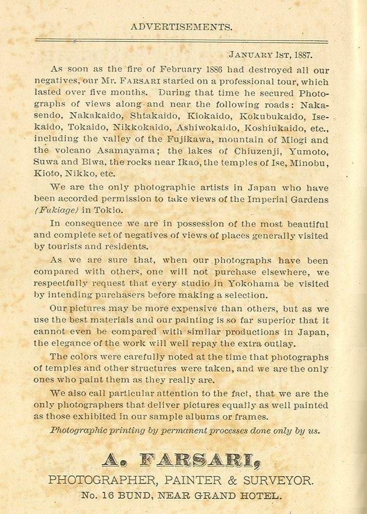 This book is an important resource for those interested in 19th century albumen photographs with Japanese views. Many of those photographs contain descriptive captions. This book was produced by a photograph seller and dates to the period when many of these images were taken and marketed. Often the locations noted in the captions on these photographs can be found in the maps/plans and text found in this book.