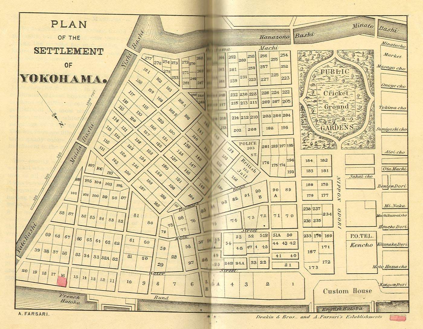 - Plan of the Settlement of Yokohama, double page, A. Farsari, b&w