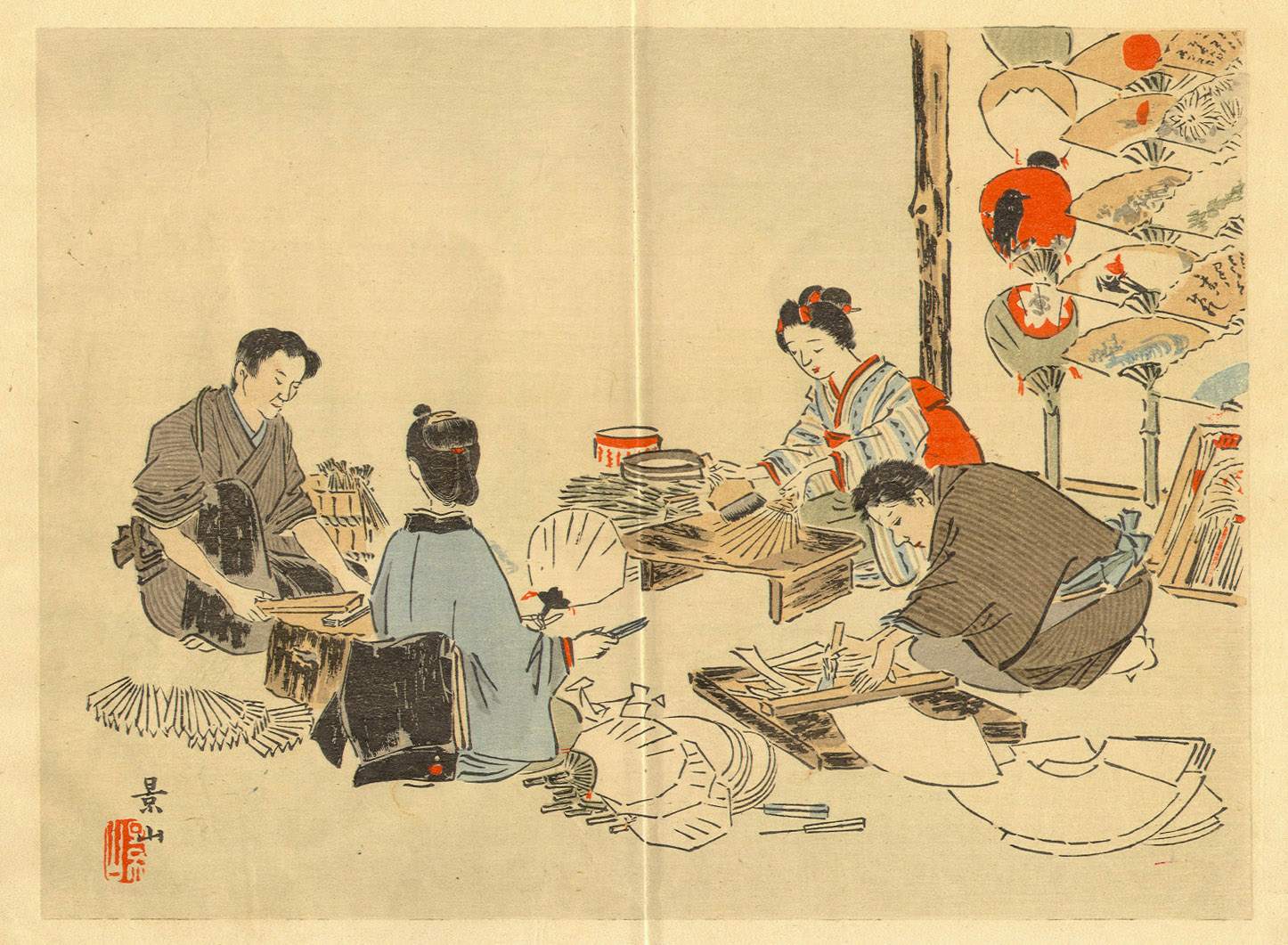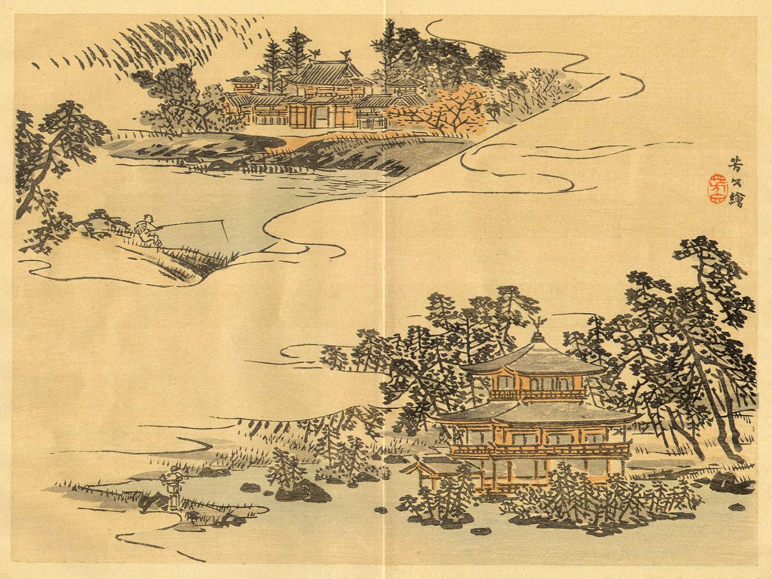 ![]() Binding Method. I have not seen this book with the original binding material in place. It appears that the book was bound by silk string ties or thin silk ribbon ties. There are 3 sets of holes for the ties. One set at the top and one at the bottom both approximately 4.5 cm from the top/bottom edges and .7 cm in from the spine edge. These sets are wide spaced (3 cm wide). In the center approximately .5 cm in from the edge there is a pair of narrow spaced tie holes (1 cm wide). There appear to be no inner binding techniques used (ie twisted string or Japanese paper (koyori), glue or staples) The spine is not covered. Color Woodblock Plates. There are 16 plates. The plates reflect the theme of the portion of the book where they are located. Each print has a seal. The woodblock prints are printed on a single sheet of high quality paper measuring (11 1/2 x 9 5/16 - 29.4 x 23.8 cm). Within this area the actual woodblock image occupies from 70-80% of the area. Mounting of the Plates. The plates are tipped to a heavy stub which is approximately 2.5 cm wide. Approximately .5 cm of the midpoint of the plate is tipped to the stub. The plate is then folded. The stub is then secured by the binding. To see the front and back of the stub, click here. Using this technique, the plate is not actually restricted by the binding (string ties) and can be opened fully in a book in the bound state. Publication Data. The book does not contain a title page or colophon. The printer, date or other publication information is not provided. Since it was intended for distribution at the World's Columbian Exposition (The Chicago World's Fair) which was held in Chicago in 1893, the date of ca 1893 is used. Because of the woodblock plates, thin text paper and binding technique (string or ribbon ties using stab holes), I believe the book was printed and assembled in Japan. The following credit is given: The thanks of the Kyoto Exhibitors' Association are due to Miss Mary G. Prince for valuable assistance rendered in the preparation of the preceding pages. To see the first three pages (Kyoto), click here. The last six pages of the book contain a listing of artists and craftsmen. To see that listing, click here. The National Library of Australia records this book as having 72 pages. Perhaps they reached that page count by counting the woodblocks (16), map, the front and back covers and internal pages that are blank. My page count did not include these to reach the total of 44 pages. I only counted pages with actual text and did not include the covers in the page count. As the pages are not numbered in the book, variances in reported pages are to be expected. All PlatesKyoto (intro) 3 pp, 1 color woodblock The Imperial Palace at Kyoto 2 pp, 1 color woodblock Nishijin Silk Fabrics 2 pp, 1 color woodblock Painting 3 pp, 1 color woodblock Arashiyama 2 pp, 1 color woodblock Kiyomidzu Temple & Kyoto Porcelain 3 pp, 2 color woodblock Mai, or Kyoto Dance 2 pp, 1 color woodblock Fans and Fan Dance 2 pp, 1 color woodblock Yuzen, or Dyed Fabrics 3 pp, 1 color woodblock Gion Festival 2 pp, 1 color woodblock Embroidery 2 pp, 1 color woodblock Kinkakuji, Golden Pavilion 2 pp, 1 color woodblock Ho-o-Do; Phoenix Hall 2 pp, no color woodblock The Daibutsu at Kyoto 3 pp, 1 color woodblock San-ju-san-gen-do, and lacquer Industry 3 pp, 1 color woodblock (Credit Page) 1 pp (Map) 1 pp Artists of Painting Dept. 6 pp (all Departments) Dyeing and Embroidery Dept. Nishijin Silk Weaving Dept. General Dept. Toy Dept. Gold Leaf Dept. Bronze or Hardware Dept. Carving Dept. Kyoto