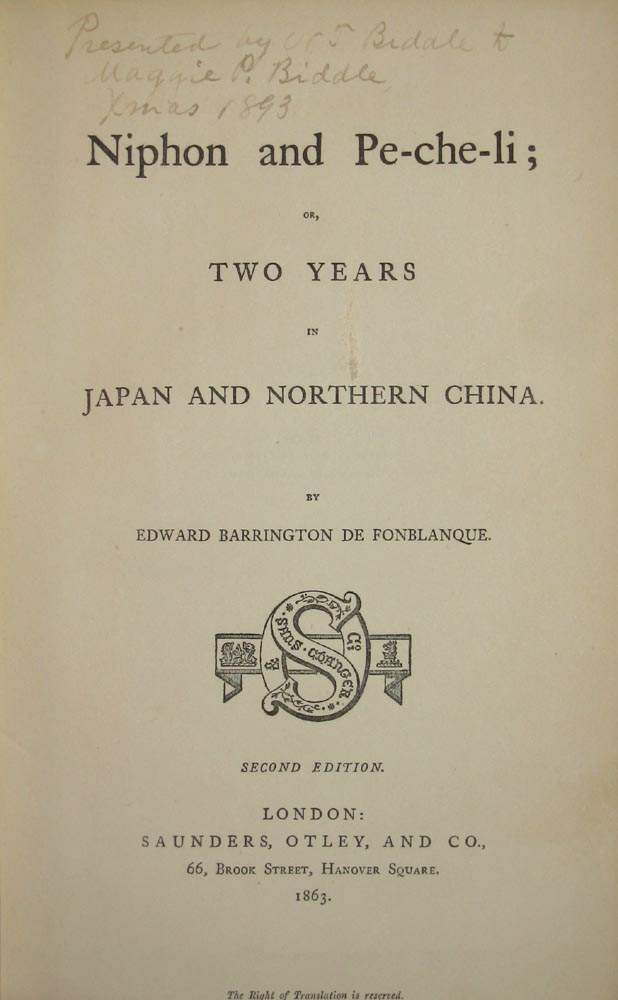 Niphon and Pe-Che-Li; or, Two Years in Japan and Northern China, London, Saunders, Otley and Co., printed by Woodfall and Kinder, 1863, 2nd Edition, 8vo (5 3/4 x 8 1/2 in - 14.6 x 21.7 cm), blue blindstamped cloth, gilt emblem on front board, gilt decoration and lettering on spine, edges gilt, 12 plates (8 color, 1 tinted map, 3 black and white), 6 text illustrations, 287 pp. Fonblanque was a member of a British diplomatic mission to Japan and China in 1860-1861. The book is evenly divided between both countries. However, all the illustrations relate to Japan.