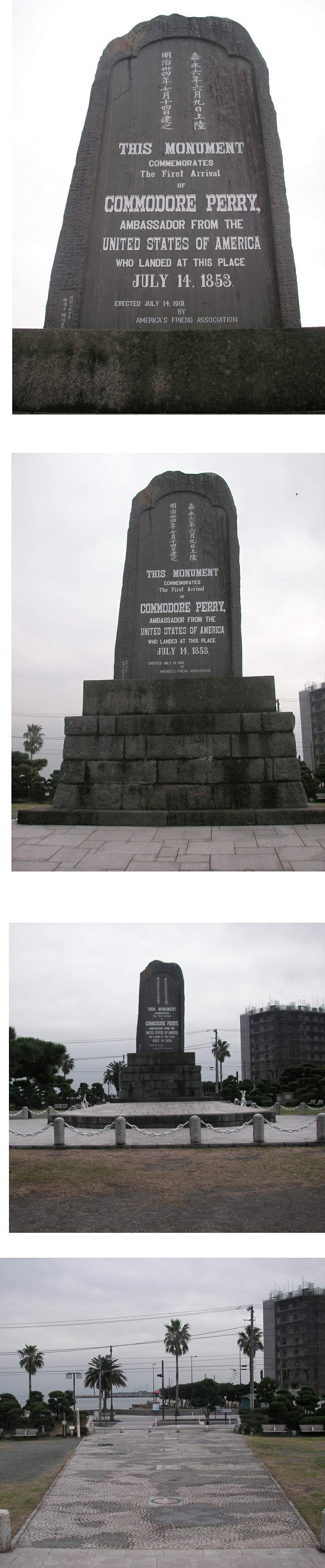 "This Monument / Commemorates / The First Arrival / of / Commodore Perry, / Ambassador from the / United States of America / Who Landed at This Place / July 14, 1853. / Erected July 14, 1901. / By / America's Friend Association."