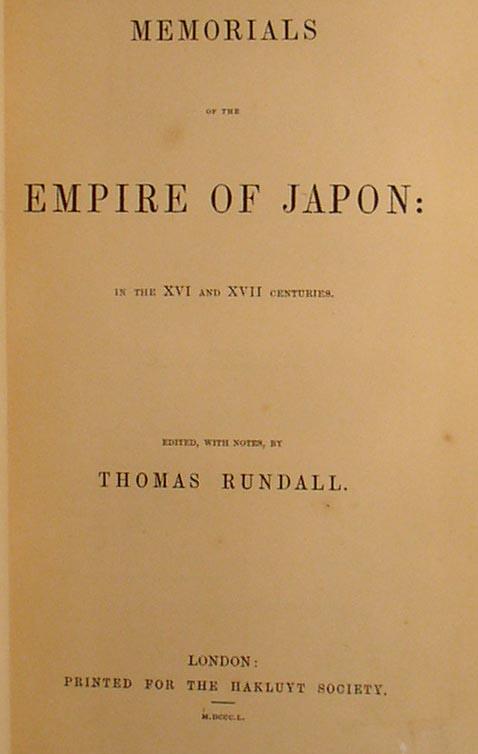Memorials of the Empire of Japon: In the XVI and XVII Centuries, London, Hakluyt Society, 1850, 8vo, frontispiece folding map of Japan, 5 facsimiles of letters/documents (2 are foldout), 187 pp. This book publishes six 17th century (1611-1617) letters written by William Adams, an Englishman living in Japan at the time, who was employed by the Shogun. An account from an agent of the East India Company is also published. The letters generally relate to foreign trade with Japan. The last four letters are from Adams and specifically concern trade with Japan by the British (East India Company). William Adams was instrumental in obtaining trading concessions from the Shogun for the British East India Company. The book has extensive notes which describe Japan in the 16th and 17th century.