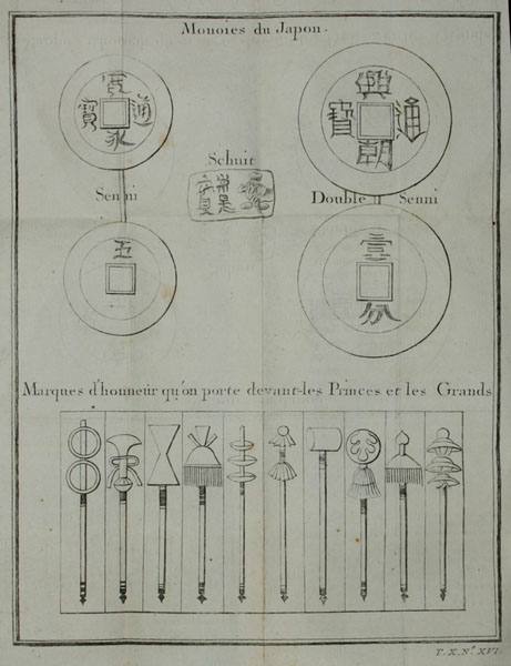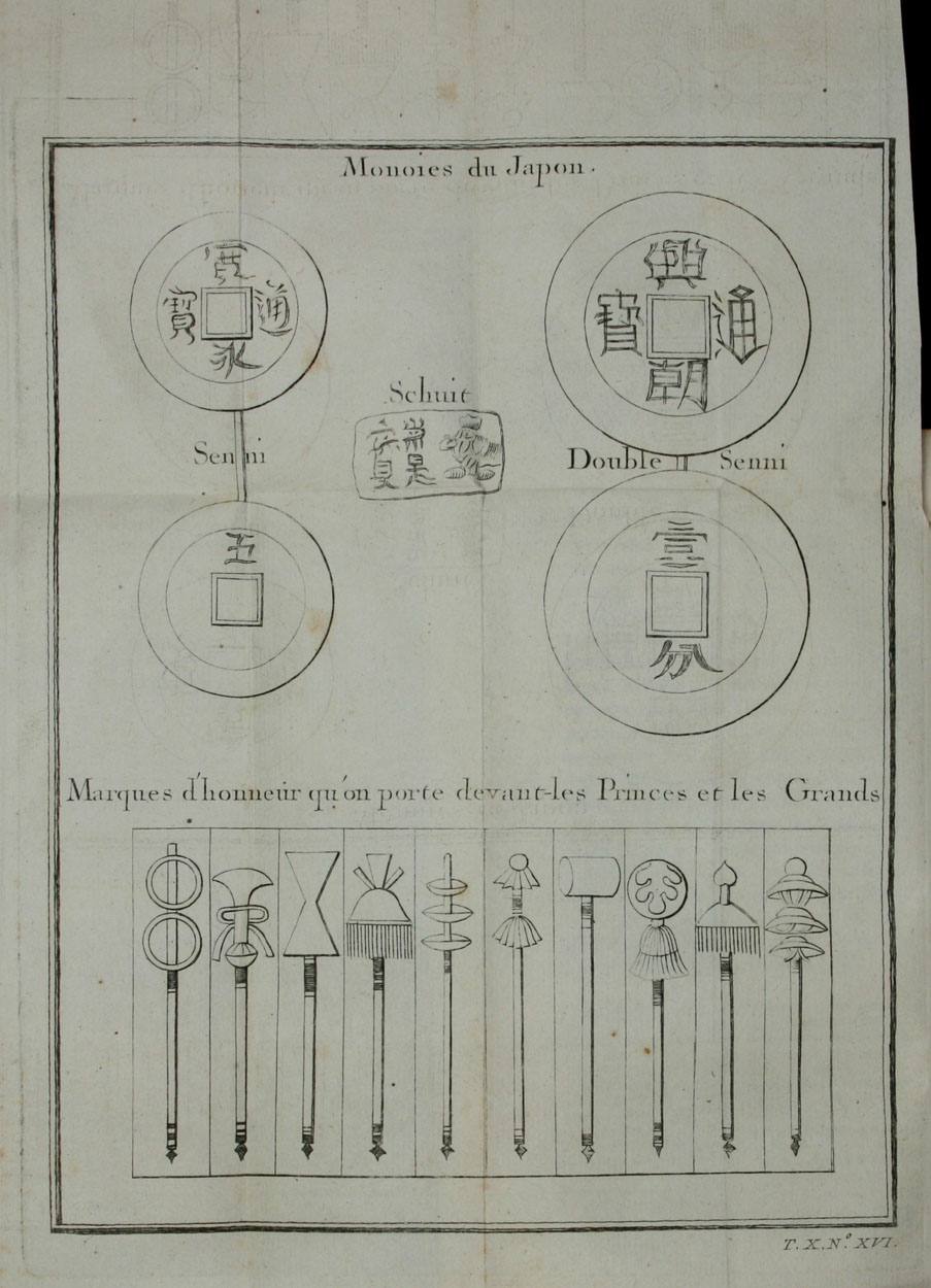 The "Avis au Relieur" at the rear shows two plates. Plate "XV Armes de l'Empire & des Princes Japonois" (page 73) and Plate "XVI Marques d'honneur, des Princes des Grands du Japon" (page 177). It does not list the other five plates found at the rear of this volume and these appear to be supplements to previous volumes. Those five plates relate to volumes on Africa.