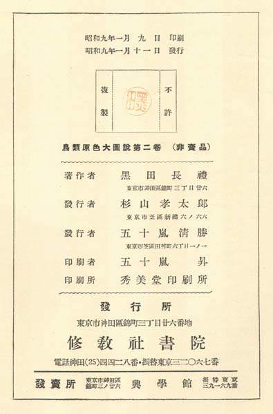 Dr. Kuroda's Birds in Life Colours, Japanese Title: Chorui Genshoku dai Zusetsu - Kuroda Nagamichi-cho, published by Shukyosha Shoin, Tokyo, 3 volumes with heavy cardboard slip cases, Volume 1 - Showa 8 (1933), Volumes 2 - Showa 9 (1934), Volume 3 - Showa 10 (1935), 4to (9 1/2 x 12 1/2 in 23.7 x 31.5 cm), half morocco, blindstamped vignettes on front board with gilt lettering in English, gilt lettering (English and Japanese) and decoration on the spines, top edge dyed, tissue guard protected title pages in Japanese and English, text in Japanese script (hiragana & kanji) but often accompanied by corresponding Latin and English script, 1092 different birds, catalogued, described and illustrated on 155 color plates (color halftone). Through a comprehensive table of contents and three different indices, the birds found in each volume are extensively cross referenced and indexed.