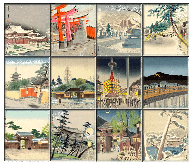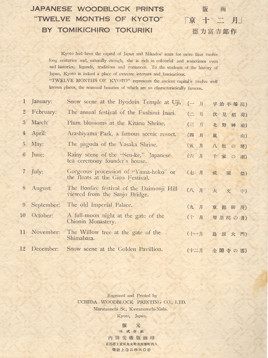 - c1960, Twelve Months of Kyoto, (folio of 12 woodblock prints), Uchida Wood Block Printing Co., Ltd, Kyoto, Tokuriki Tomikichiro, purchase here.