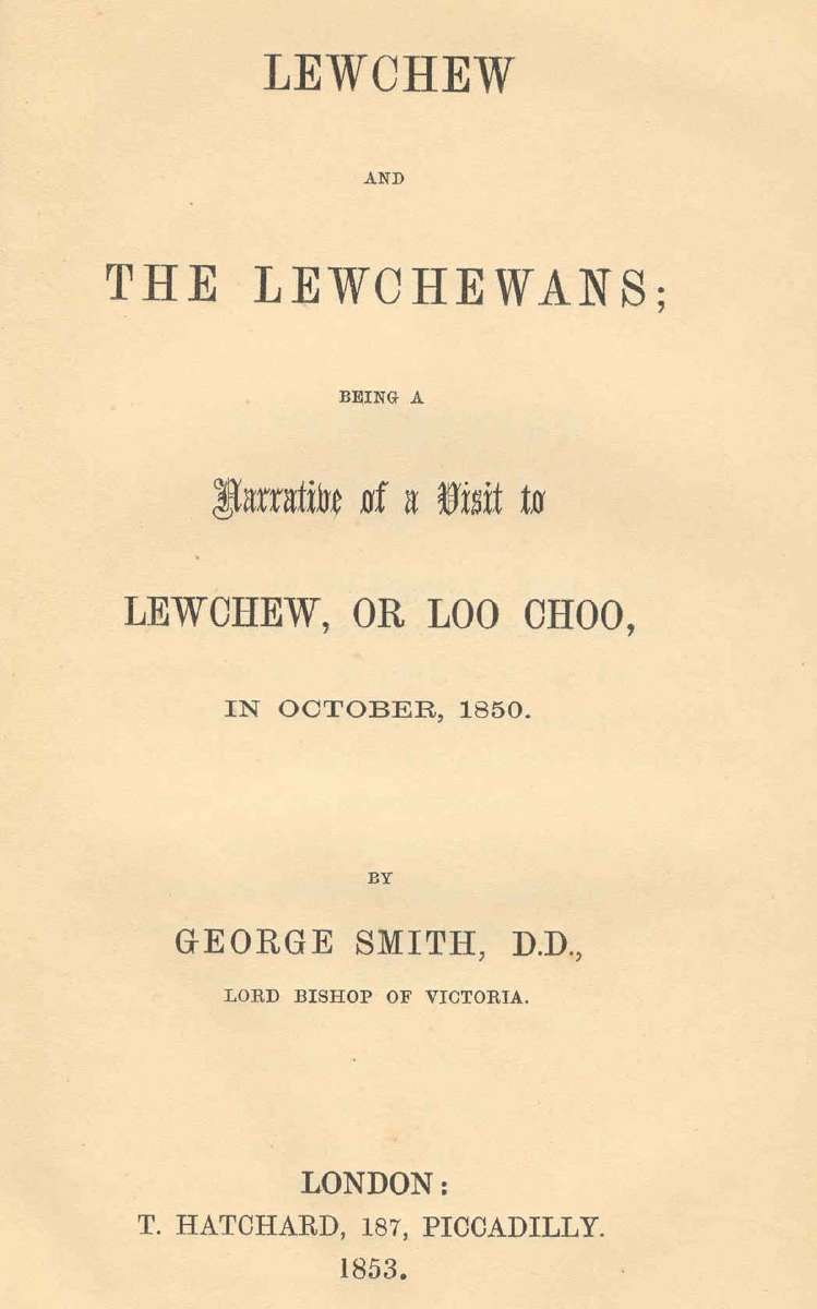 Smith, George (Bishop of Victoria): Lewchew and the Lewchewans; Being a Narrative of a Visit to Lewchew or Loo Choo, in October, 1850, London, T. Hatchard, printed by G. J. Palmer, 1853 (1856), 12mo (4 1/2 x 7 in - 11.6 x 17.7 cm), blue blindstamped cloth with gilt title on front board, black and white engraved frontispiece showing the "Residence of Dr. Bettelheim, Loo Choo," i~viii, 36 pages of publisher's advertisements at the rear, 95 pp. George Smith, D.D. was the Lord Bishop of Victoria (Hong Kong). This is probably the most comprehensive English language account relating to Okinawa published prior to the narrative of American Expedition to Japan headed by Commodore Perry which arrived in Okinawa more than two years after Smith's visit. This book is Bishop Smith's account of his efforts, supported by the British Government, to obtain better treatment of Dr. Bernard Bettelheim. Bettelheim, a medical missionary, had been sent to Okinawa in 1846 by the British Loochoo Missionary Society. His presence on Okinawa was unwelcome by the authorities and his activities were constantly limited and hindered. Both Bettelheim and the Okinawan authorities complained about his situation but an impasse had developed. Neither side appeared to be willing to give in. Bishop Smith's visit was intended to show the Okinawans that the full authority and power of the English government supported Bettelheim's continued and unrestricted presence on Okinawa. Bishop Smith's account of his visit, which spanned the period from Oct 3 - Oct 10, 1850, provides exceptional insight into the conditions under which Bettelheim conducted his medical mission. It is an important account of Okinawa as it stood positioned at the leading edge of the relentless push by the Western powers to force Japan to open to outside trade and contacts. In addition to describing Dr. Bettelheim's mission, Bishop Smith provides insight into the geography, culture and political structure he found. The publisher's advertisements are dated November, 1856 and printed by G. Barclay. While the book carries a publication date of 1853 on the title page, it was obviously assembled later. This edition was probably distributed in late 1856 as a result of the intense public attention on Japan and Okinawa that resulted from the successful American expedition to Japan. Bishop's Smith's Report contains a 6 page (pages iii~viii) introduction which outlines the circumstance surrounding the mission and the reasons for the visit. A PDF file containing the introduction and the first 20 pages of text (20 of 95) is here. To open a PDF file you must to have an Adobe Reader program installed on your system. The current version of the Adobe Reader is 7.0. If you do not have the program installed, or have an outdated version, it can be downloaded free at the Adobe web site which currently is: http://www.adobe.com/products/acrobat/readstep2.html