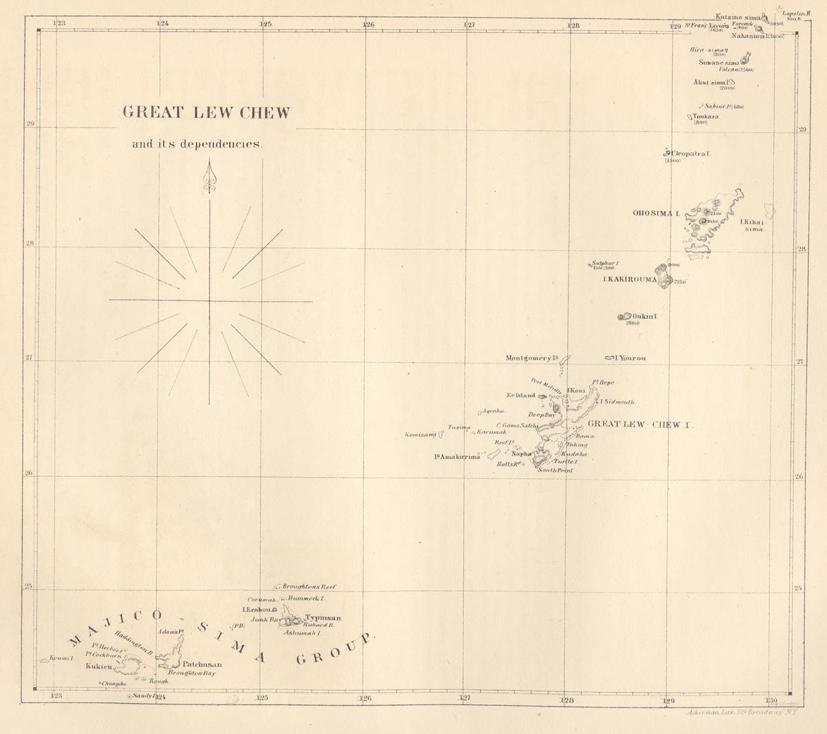 The MEIA-CO-SIMA, or "Eight Islands," called in the old chart the Hajicosima Group, have been surveyed by Captain Belcher, and are found to possess several good harbors and anchorages. They are inhabited by an intelligent, mild, and inoffensive people, evidently of the same race as the Loo Chooans, and are governed by chiefs appointed by the Prince of Great Loo Choo, to whom they pay an annual tribute. The islands are represented to be fertile, and under tolerable cultivation. The variety and beauty of the vegetation clothing the sides of the mountain of Pa-tchan-san and its neighbor, are represented by Captain Belcher to be very striking. (at page 15)