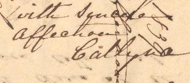 I have a letter (available for purchase) from Brooklyn New York in December of 1839 to "Miss E th Perry - Care of Ms Com Perry - New Port, Rhode Island". The letter begins "...dear Lizzy...." Perhaps this letter to Isabella Perry who would have been approximately 5 years old. However, it reads much more like a letter addressed to an adult than a child. The mature content of the letter would be more consistent with a letter to the Commodore's wife and not child. I believe the letter is from "Catlysia" ?? "Cathysia" ?? "Cat(l)hyna" (see below):