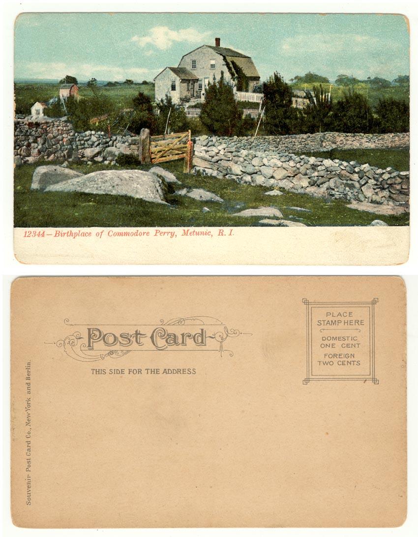This is a picture post card from ca 1910. It bears the inscription "Birthplace of Commodore Perry, Metunic, R.I.". According to Rev Calbraith Bourn (see book listed below), this is a home built on the old Perry Family Manor by Commodore O.H. Perry and, therefore, it is not the birthplace of either Commodores M.C. or O.H. Perry. Bourn notes that the property passed from the Perry family but Commodore M.C. Perry was successful in purchasing it back and it eventually was owned by his daughter, Mrs. George Tiffany. (This item is available for purchase.)