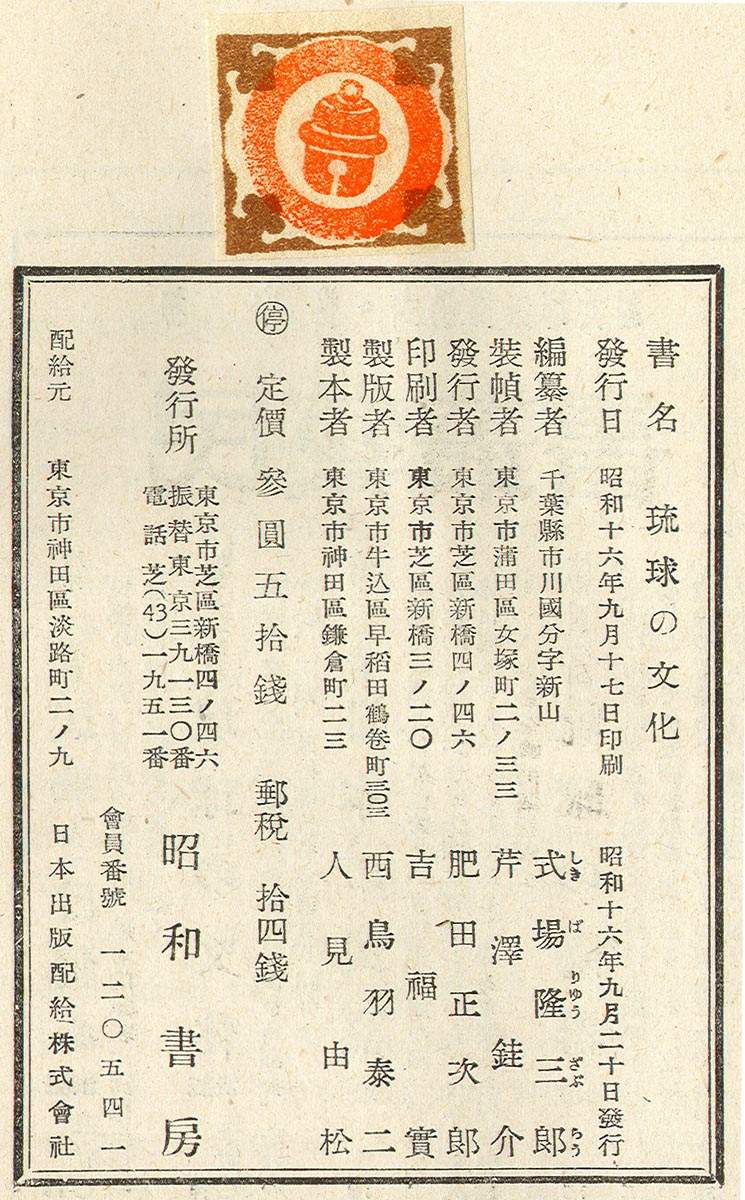 Folk-crafts Series, No. II, On Ryukyu Culture (Ryukyu no Bunka), Tokyo, Showa Shobo, Nippon Folk-crafts Society, 1941, 12mo (5 1/2 x 7 1/2 in - 13.7 x 18.6 cm), English language (pages 1-40 - reading front to back), Japanese language (pages 1-304 - reading back to front), 20 pages of halftone photograph reproductions (39 different images) at the front of the Japanese section, paper covered boards with paste on color illustration, black lettering on boards and spine, cardboard slip case, 344 pages total (Japanese and English sections). One (No. II) in a series of books on Japanese folk-crafts including those in the Ryukyu Islands. For more information on this book, click here.
