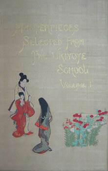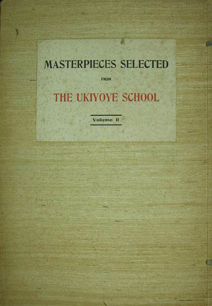 Masterpieces Selected from the Ukiyoye School (Eibun Ukiyoe-Ha Gashu), Shimbi Shoin, Tokyo, 1906, Volume I of a five volume set, folio (13 1/2 x 19 1/2 in - 34.2 x 49.5 cm), silk covered boards with a woodblock illustration on the front board, edges beveled, spine covered in decorated silk cloth, purple silk ties, title in English in gilt on front board, top and bottom page edges in gilt, text in English, 33 plates (31 color woodblock and 2 black and white collotype), 38 text pages (pages 37-74). Each plate is preceded by a tissue guard with information in English regarding the plate that follows. There are numerous black and white text illustrations in the text pages. While most are woodcuts, a few are collotypes. Issued with a straw textured folding case with ivory type clasps. According to Shimbi Shoin catalogues "Regular" and "Special" editions were issued in a total quantity of 600 sets. Each volume in a set contains a numbered limitation statement indicating the number of the set out of 600 sets.