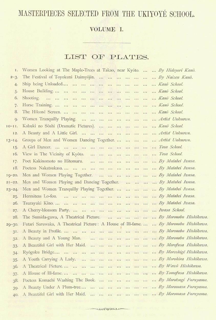 ...in five volumes of 30 plates each. Volume I contains an essay on the origin and development of the Ukiyoye school, biographical data sketches of the artist and some critical descriptions. 35 pp text and 39 plates. (Edition de luxe, 100 copies, 250 yen the set; ordinary edition, 600 copies, 200 yen the set.