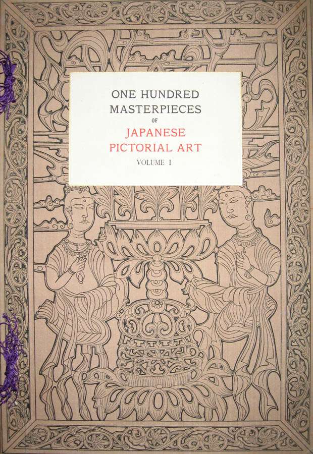One Hundred Masterpieces of Japanese Pictorial Art Selected by Members of the Faculty of the Tokyo Fine Art School, Shimbi Shoin (13 Shinsakana-Cho, Kyobashi-Ku), 1909, first edition, Volume 1 only of a 2 volume set, folio (19 1/2 x 13 1/2 in - 49.5 x 34 cm), silk covered boards, blue string tied, spine covered in decorated silk, detailed table of plates, 50 plates in color and monochrome, pictorial cloth boards, black on bronze, paper labels on front covers, clasped chitsu case for each volume. Introduction of 23 pages, 50 plates (6 in color). The color plates are color woodcuts and are tipped in. The monochrome plates are black and white collotypes printed directly onto the page. Maohiko Masaki, the editor/preface writer, was the Director of the Tokyo Fine Arts School at the time of publication. In Volume 1 there is a 2 page preface, a three page table of plates and 23 text pages (11 Chapters) discussing the various periods (593~1867) of the art reproduced in the plates. Each plate is on thick, high quality, paper stock and protected by a descriptive tissue guard. The non-plate/tissue guard pages are double (folded over uncut) pages.