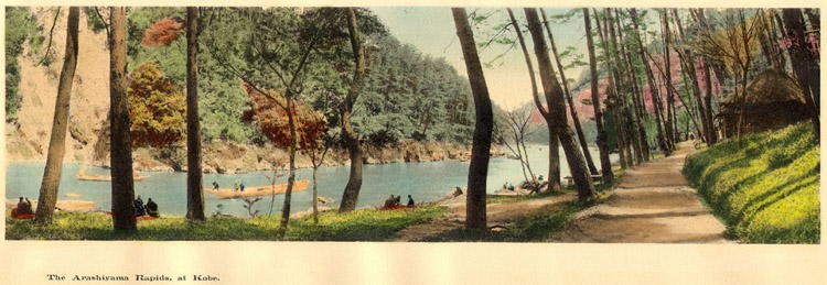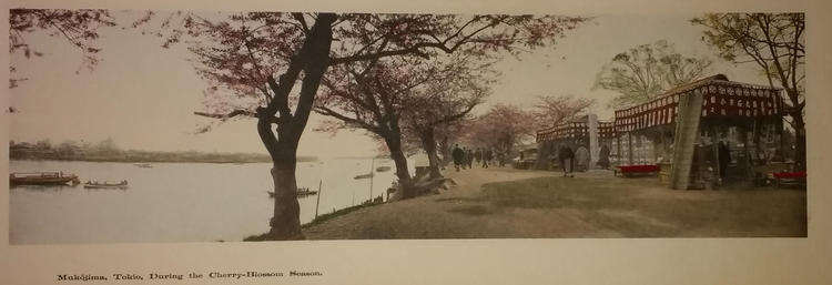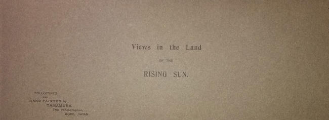 Tamamura Kazaburo: Artistic Japan, Views in the Land of the Rising Sun, Kobe, Japan, Tamamura, nd (c1906), oblong 5 5/8 x 14 3/4 in (14.1 x 39.7 cm), cloth covered outer flexible boards with single string tie, thick brown paper inner cover, housed in cloth covered wrap-around case, unnumbered but 24 plates. The title Artistic Japan is printed on the front board. The inner cover page indicates "Collotyped and Hand Painted by Tamamura, The Photographer, Kobe, Japan" and carries the second title Views in the Land of the Rising Sun. This book is composed of 24 hand colored collotype photographs by "Tamamura the Photographer" actually printed on the plate. Each plate has a type set descriptive caption printed at the bottom left of the image. The collotypes are protected with tissue guards. There is no colophon. Links to detailed information on this material are below: Unnamed Bound Folio of Tipped to Plate Prints (25 plates - 7 3/4 x 17 in (20 x 43 cm)) Characteristic Japan. Views and Characters in the Land of the Rising Sun (24 plates - 7 1/2 x 16 1/2 in (19 x 42 cm)) Artistic Japan, Views in the Land of the Rising Sun (22 plates - 5 5/8 x 15 1/2 in (14.1 x 40 cm)) Artistic Japan, Views in the Land of the Rising Sun (24 plates - 5 5/8 x 14 3/4 in (14.1 x 39.7 cm)) All Plates: Mukojima, Tokio, During the Cherry-Blossom SeasonListing of Plates: