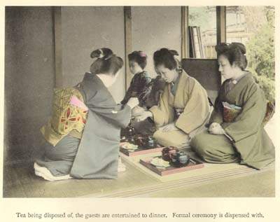 The "Ceremonial Tea" Observance in Japan, Kobe, "T. Takagi Photographic Studio and Art Gallery, Kobe," Taisho 6 (1917), 2nd edition, oblong 8vo (7 x 10 in - 18 x 25.5 cm), English language, hand colored title page, one page "Explanation" of the significance of the tea ceremony by H. Spencer, 15 hand colored collotype plates with captions, plates protected by tissue guards, silk type cloth over cardboard with handcolored illustration recessed in the front board, double string ties, unpaginated. The actual images are approximately 4 x 6 in (10.5 x 15 cm). A pictorial essay on the tea ceremony in Japan at the turn of the 20th century.