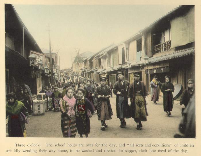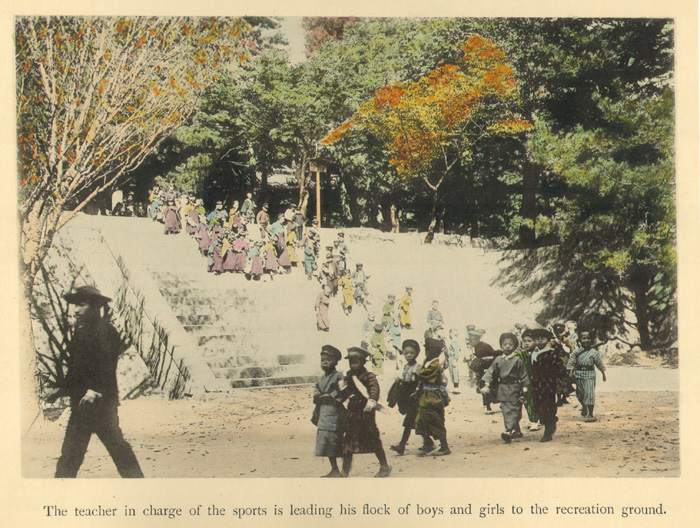 The School Life of Young Japan, Kobe, "Tamamura the Photographer, Kobe," Meiji 40 (1907), February, oblong 8vo (7 x 10 in - 18 x 25.4 cm), English language, hand colored title page, introductions (first part and second part), 20 hand colored collotype plates with captions, tissue guards, hard boards covered with blue silk type fabric, spine covered in same fabric, unpaginated. The actual images are approximately 4 x 6 in (10.5 x 15 cm). Pictorial depiction of various school scenes. The first part (12 plates) depicts scenes in school and to and from school. The second part (8 plates) has plates relating to school sports.. While there is no mention of Takagi in the colophon, the book is sometimes found accompanied by a slip advertisement of other books by Takagi. To see that advertisement, click here.