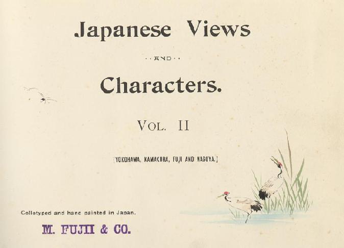 Japanese Views and Characters, Vol. II (Yokohama, Kamakura, Fuji and Nagoya), M. Fujii & Company, ca 1910, horizontal 8vo (6 x 9 in - 15.2 x 23 cm), 24 hand colored collotype plates with captions in English, tissue guards, hard boards covered with fabric, string tied, unpaginated. The actual images are approximately 4 x 6 in (10.5 x 15 cm). The hand coloring of the collotype plates in these books is well executed with a wide range of colors employed, to include pastels.